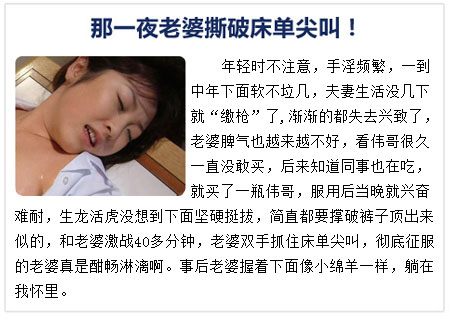 和老婆结婚才两年,性生活却是像结婚十年的夫妻一样,有时候甚至一个星期都没有性生活,并不是我们之间的感情不好,而早我的性能力方面实在不行。每次性生活都不会超过三分钟,反应越来越慢,根本不能进行,三两下就没了,妻子虽然并没有说班责备的话,但从黯淡的眼神当中就可以看得出她很失落。服用万艾可后,足足硬了30多分钟,让我整个人的精神面貌也开始大为不同,每次都让对方非常满足。现在我是能给她性满足的男人,能让她销魂的男人,能和她翻云覆雨的男人。